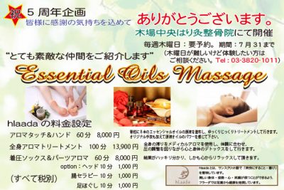 5周年企画!! 2017.06.20 ありがとうござます。開業して5周年を迎えることができます。皆様に感謝の気持ちを込めて企画しました。 hlaada代表の北原美穂先生によるアロマオイルマッサージを体験して頂くことができます。 限られた期間ではありますが、木場中央はり灸整骨院にて行われます。 ご希望の方は03-3820-1011までご連... > 続きはこちら