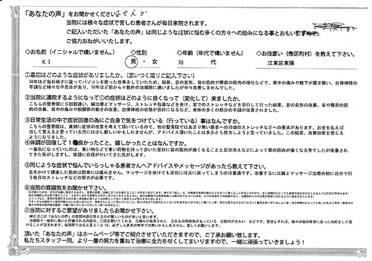 30年ほど毎日椅子に座ってパソコンを使った仕事をしていたため、猫背、首の変形、背の筋肉や臀部の筋肉の硬化などで、背中の痛みや靴下が履き難い、自律神経の不調など様々な不具合があり、10年ほど前から十数件の治療院に通いましたが中々改善しませんでした。