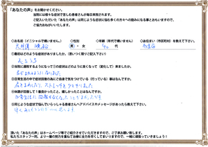 自転車で転倒でのむちうち症状 杉並区 整体2014/06/16 最初はどのような症状がありましたか。 むちうち 当院に通院するようになって①の症状はどのように良くなって(変化して)来ましたか。 首がまわるようになりました。 > 続きはこちら