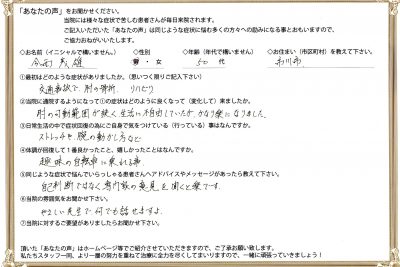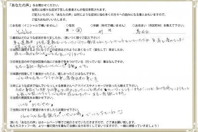 すごく体が軽くなった。首は以前の事故で後遺症が残ったが、そこも良くなっていると思います。